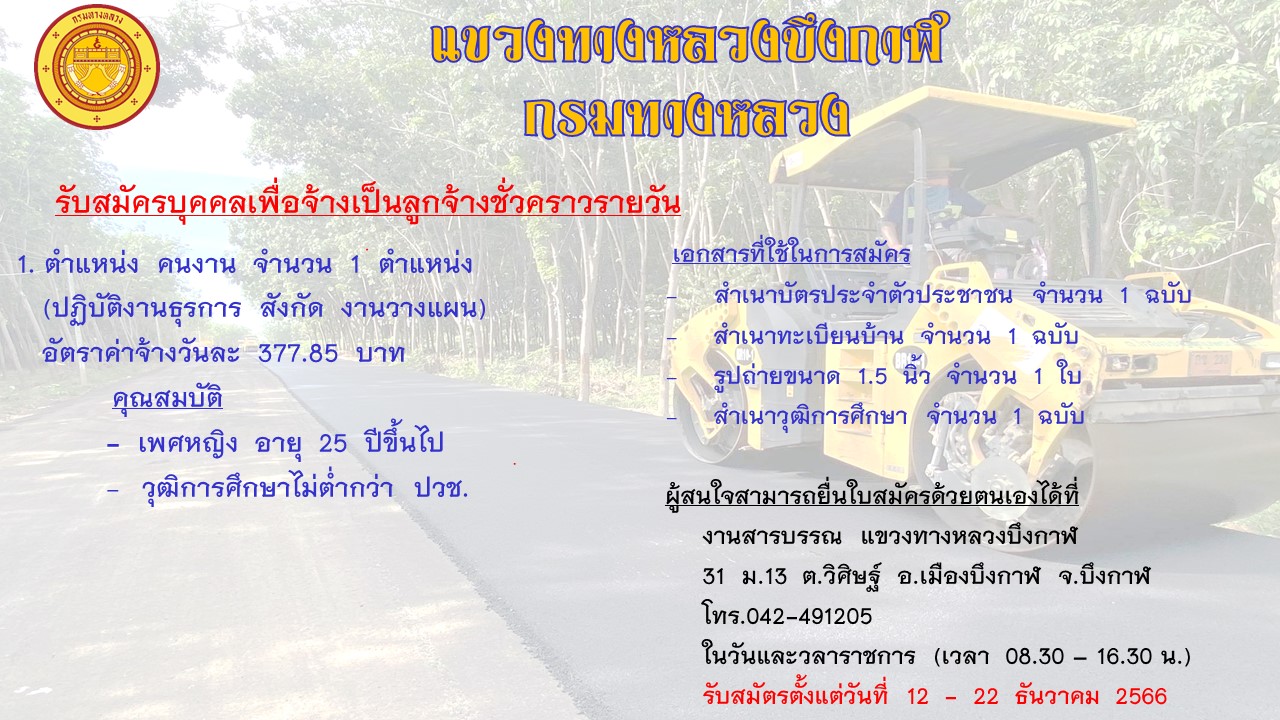 แขวงทางหลวงบึงกาฬ เปิดรับสมัครงานเพื่อจ้างให้เป็นลูกจ้างชัวคราว รายละเอียดดังรูปภาพที่แนบมาพร้อมนี้