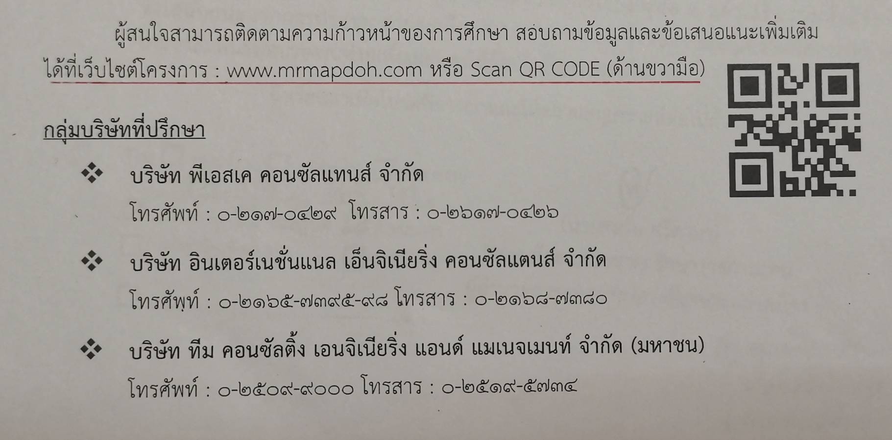 ** ท่านใดสนใจ สามารถติดตามความก้างหน้าของการศึกษาฯ โดบยการสอบถามข้อมูลเพิ่มเติมได้ที่เว็บไซต์โครงการ www.mrmapdoh.com หรือแสกน Qr Code ตามเอกสาร ดังรูป